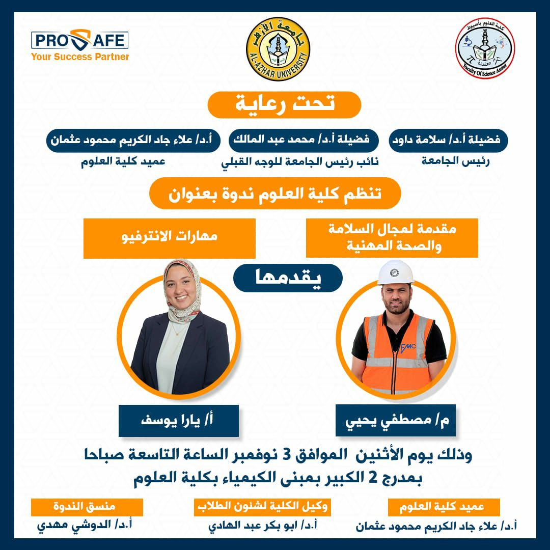 كــلــيــة الــعــلــوم بنين جــامــعــة الأزهــر بأســيــوط تعقد ندوتين عن السلامه والصحة المهنية وعن مهارات الانترفيو. و ذلك يوم الإثنين الموافق 3 نوفمبر الساعة 9 صباحًا بالمدرج الكبير رقم 2 بقسم الكيمياء الجزء الأول عن مجال السلامة والصحة المهنية ،، وكيف تبدأ طريقك فى مجال السيفتي بخطوات ...